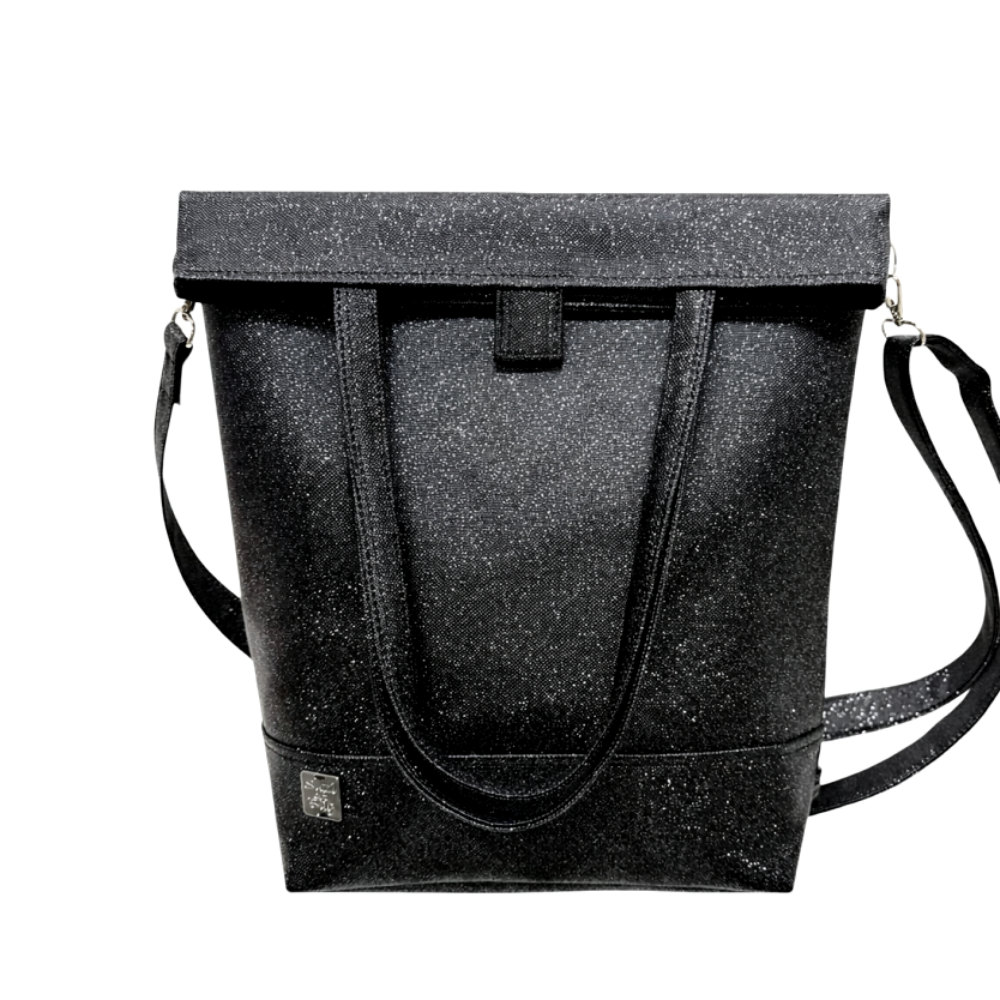 Különleges fekete csillogós bőrből készült, 3in1 táska többfunkciós: oldaltáskaként és egy kis átalakítással hátizsákként is hordható, valamint hosszabb vállpántja segítségével a vállon is viselhető. Nagyon jó minőségű textilbőrből, vagy vastag vízlepergetős vászon és szövet keveréke. Felül cipzárral záródik, belül és kívül is van egy-egy cipzáros zsebe. Vállpántja állítható, szélessége 3 cm.